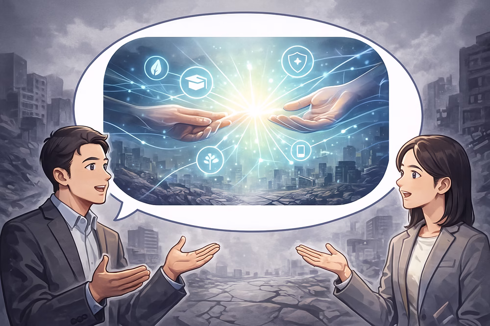この標語は社会課題を限定せーへんで「いま社会で問題になっとる事柄をテクノロジーを使って可能な限り改善する」ってことやと思う