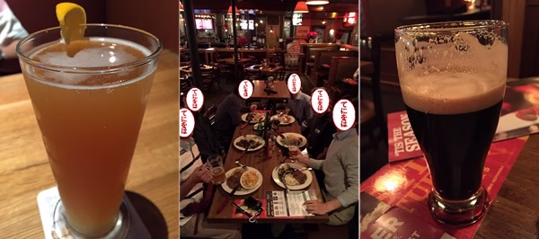 ホテルで一息ついた後、前乗りしている仲間2人と合流して実験の無事を祈って前祝いです。