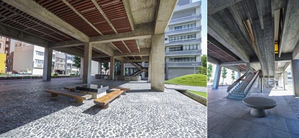 ピロティは一転、コンクリート打放しの柱と梁と階段が無骨な雰囲気を醸します。
