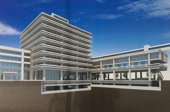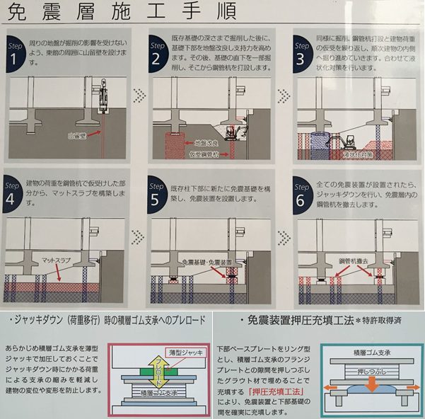 これは工事仮囲いに貼られた透視図で、新たに地下に設置される免震層の様子を示すもの。