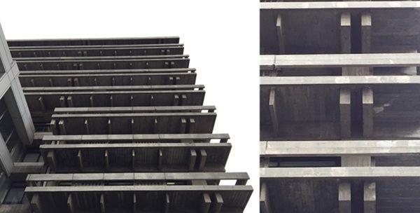 鋭利なサイコロの如く直線と直角のみで構成されたファサードから突き出るリズミカルな小梁群。