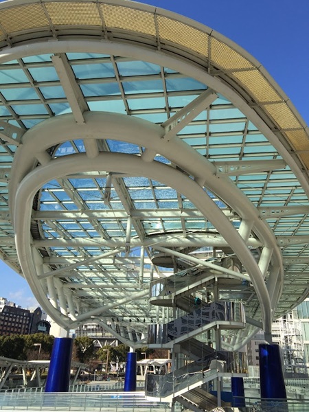 透明感溢れる巨大屋根をたった4本の柱で支え、あたかも空中に浮いてるように魅せるとは。